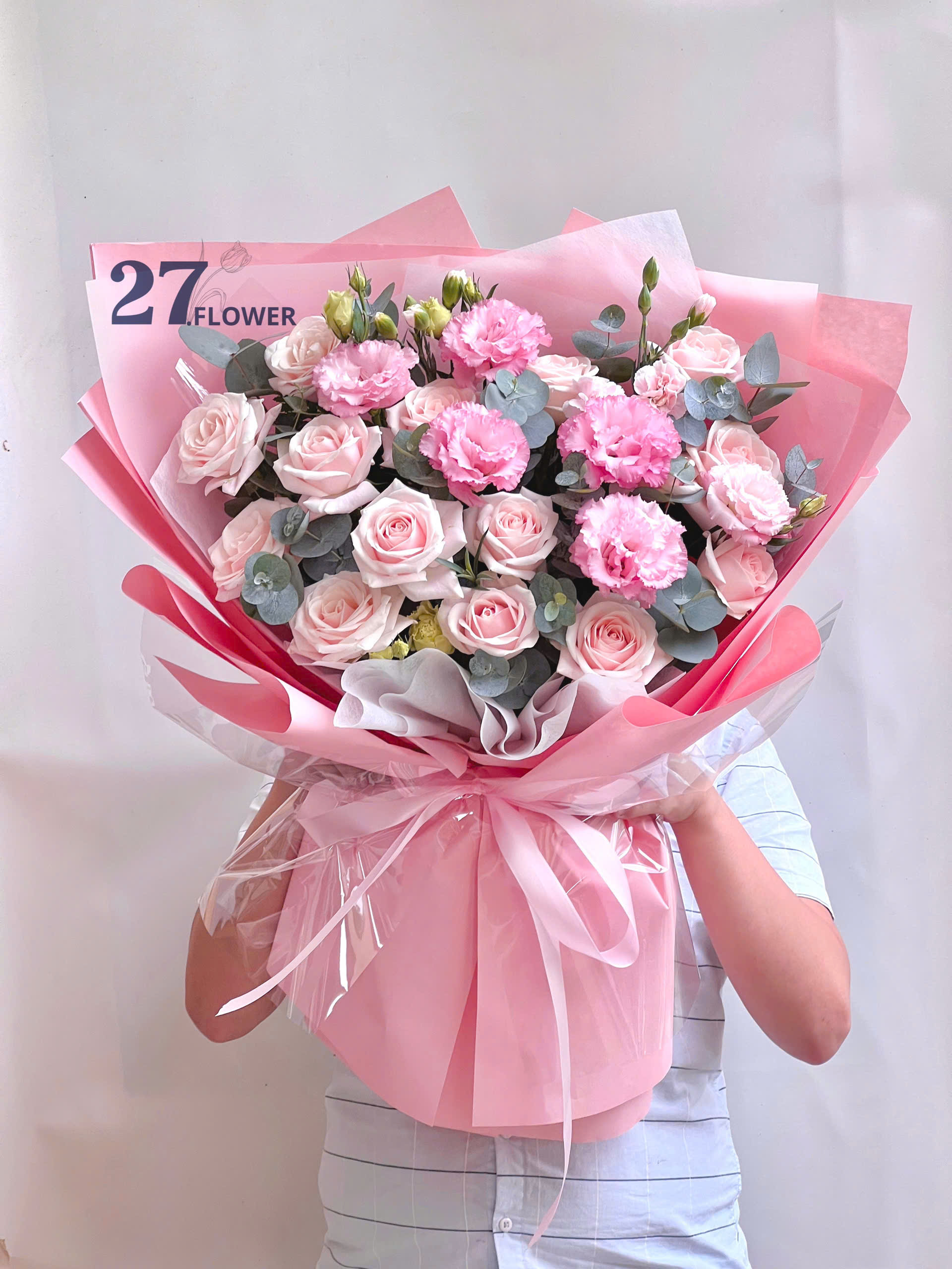 Sản phẩm được bó thủ công bằng tay,hoa theo mùa, độ nở,dáng hoa,hoa thay thế, thành phẩm sẽ đạt 70% so với mẫu.